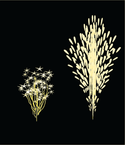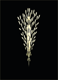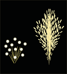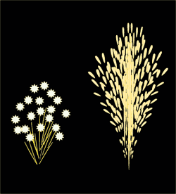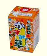 この花火は「かすみ草」をイメージして作りました。点火後8秒ほどかすみ草の花のように白い火花が咲き、その後約3mほど銀色の火の粉を噴き出します。 薬量約13.5g |