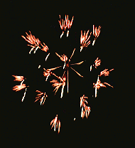 が銀色に光り、尾を引いて紅色の花か開く。