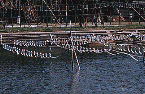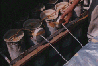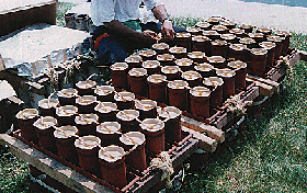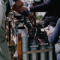 右の写真は一斉に玉を打ち上げるときの方法です。筒に直接速火線を入れ込みすべての筒の発射薬に同時に点火するやり方です。スターマインの最後に一斉に上がるときはこのやり方です。結構気持ちがいい打ち方ですよね。おまけに錦冠の玉が上がるとお客さんの歓声が一番よく聞こえます。