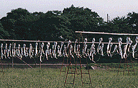 ワイヤーに直接玉を吊し導火線は「段みち」にしておき、速火線で点火していきます。写真の玉は、3号玉までですが、打ち上げるわけではないので場所があれば無限大の大きさまで行うことができます。諏訪湖などは特に有名でしょう。