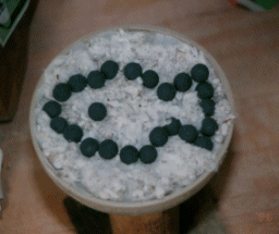 左の図は、「魚」の形に並べたところです。構造的には片方の玉殻にこのような絵を星で並べたものを、もう片方の玉殻には割火薬を積めます。