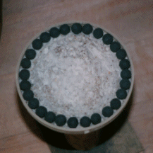 割物の場合は、親星を玉殻全体に並べますが、「土星」のリングは親星を左の図のように一列だけ並べます。星のないところは、綿の実をしっかり引き詰めて星が移動しないように固定します。花火屋さんによっては、親星を2列に並べる方もいます。